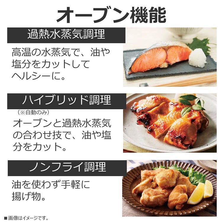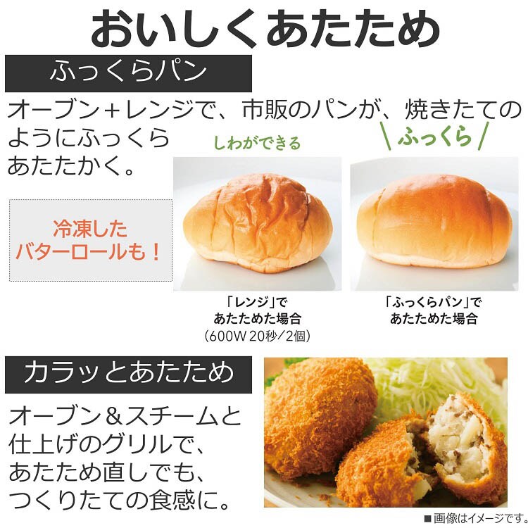 | ドアタイプ:たて開き オーブン段数:1段 トースト機能: トースト6枚切 2枚:約6分(約4分20秒で裏返し)冷凍トースト(6枚切り)2枚:約7分30秒(約5分20秒で裏返し)スチームトースト2枚:約7分45秒(約5分で裏返し) グリル: 大火力石窯ドームグリル 過熱水蒸気:有 100度~250度 オーブン・グリル(熱源):ヒーター 庫内形状:フラット庫内 センサー種類:8つ目赤外線センサー/温度センサー 庫内コーティング:遠赤・脱臭ブラックコート(庫内丸ごと遠赤) 庫内有効寸法(幅×奥行×高さ):約398mm×約330mm×約232mm オーブン温度調節範囲:100度~250度 省エネ基準達成率:104%:目標年度 2008年 レンジ出力(最大):1000W レンジ・庫内容量:30L レンジ出力(手動):レンジ1000W/600W/500W/200W相当/100W相当 年間消費電力量:76.3kWh/年 年間消費電力量(待機時):0kWh/年 オーブン機能の年間消費電力量:18kWh 電子レンジ機能の年間消費電力量:58.3kWh メニュー数:104 総レシピ数178 加熱方式:上ドームヒーター、下シーズヒーター スチーム加熱: スチームレンジ お手入れ機能:手間なしお手入れコース(10分) 解凍機能:全解凍+半解凍 3つの解凍(お急ぎ解凍、スチーム全解凍、さしみ・半解凍) 解凍方法:スチーム+レンジ 3つの解凍(お急ぎ解凍、スチーム全解凍、さしみ・半解凍) 発酵温度:30度・35度・40度・45度 操作部:ダイヤル&ボタン オーブン後連続あたため: 手動 省エネ機能:省エネ・オートパワーOFF 庫内灯:LED 設置条件:背面ピッタリ左右は2cm以上、上方は10cm以上開けてください。右を4cm以上開けると左は0cmでお使いいただけます。 |