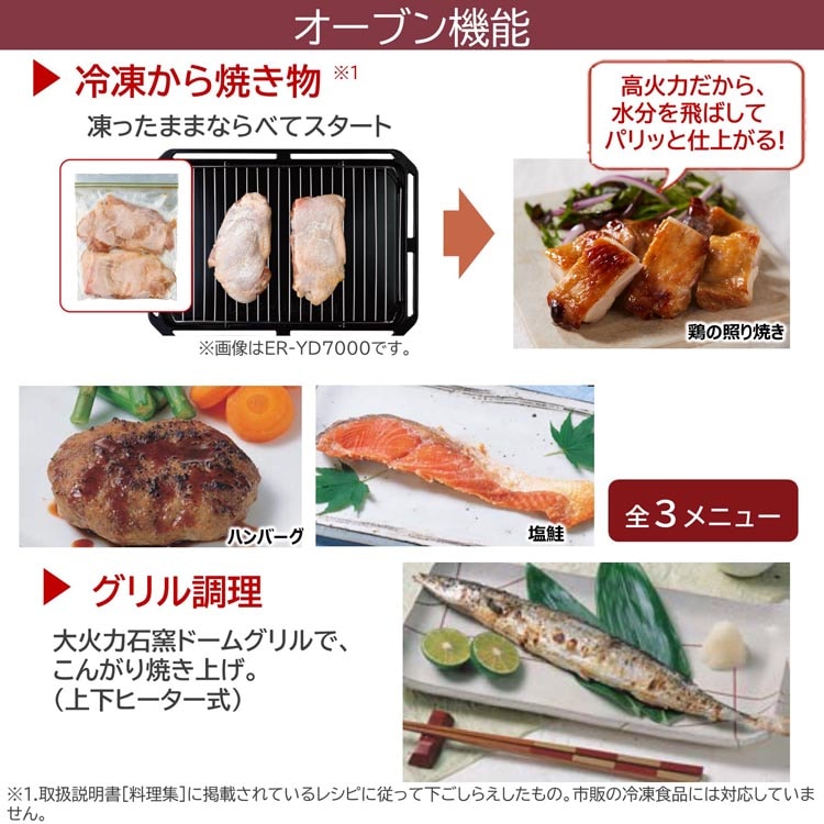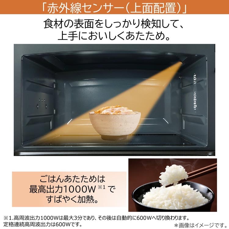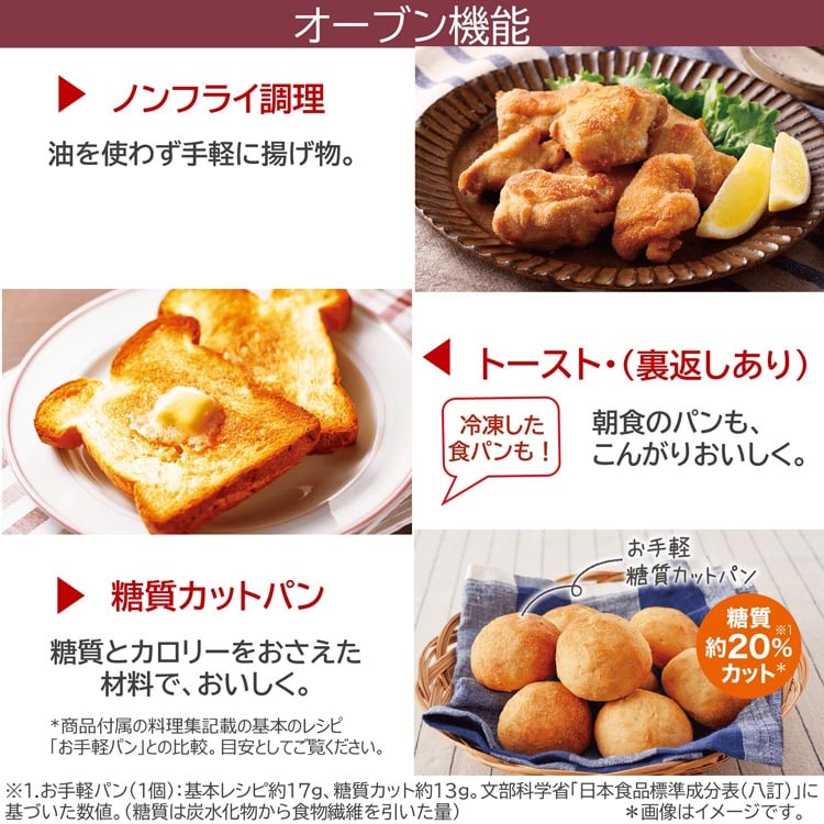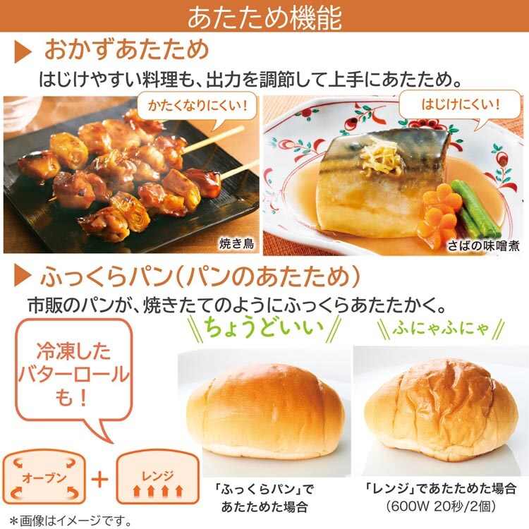 | ドアタイプ:たて開き オーブン段数:1段 トースト機能:有 オートトースト(6枚切り)2枚:6分5秒(約4分20秒で裏返し)、オートトースト(冷凍)(6枚切り)2枚:8分(約5分40秒で裏返し) グリル:有 大火力石窯ドームグリル 過熱水蒸気:無 オーブン・グリル(熱源):ヒーター 庫内形状:フラット庫内 センサー種類:赤外線センサー(上面配置)、温度センサー 庫内コーティング:庫内よごれプロテクト(扉部、底面を除く) 庫内有効寸法(幅×奥行×高さ):約384mm×約323mm×約215mm オーブン温度調節範囲:100度~250度 省エネ基準達成率:100%:目標年度 2008年 レンジ出力(最大):1000W レンジ・庫内容量:26L レンジ出力(手動):1000W(最大3分)、600W・500W連続、200・100W相当 年間消費電力量:70.4kWh/年 メニュー数:91 (総レシピ数124、自動メニュー数91) 加熱方式:上下ヒーター加熱 上:ドームヒーター 下:シーズヒーター(埋め込み) スチーム加熱:可 お手入れ機能:脱臭 解凍機能:全解凍+半解凍 解凍・さしみ 解凍方法:レンジ 解凍・さしみ 発酵温度:30度・35度・40度・45度 操作部:ボタン オーブン後連続あたため:可 手動 省エネ機能:省エネ・オートパワーOFF 庫内灯:LED 設置条件:背面ピッタリ ※上方10cm 右3.0cm 左3.0cm以上開けてください |