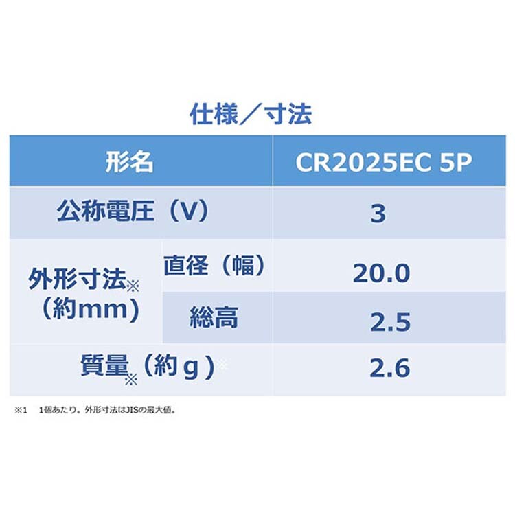 | エコパック 公称電圧:3V 外形寸法※1:幅(直径)20mm×高さ2.5mm(1本(1個)あたり) 質量:1本(1個)あたり約2g ※1外形寸法はJISの最大値 |