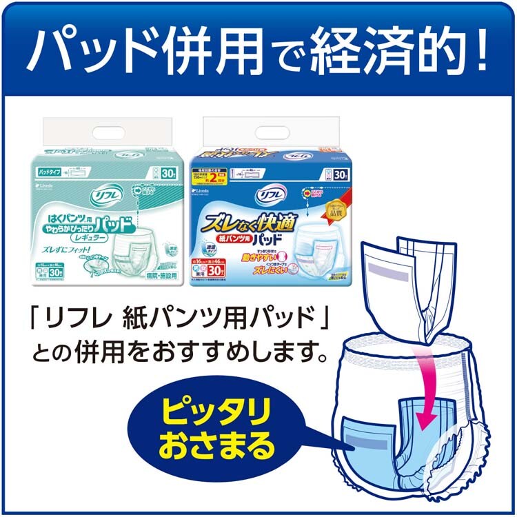 ●横モレ防止ギャザーが足まわりにフィットし、尿をせき止めます。リフレの紙パンツ用パッドとあわせて使うとさらにモレ安心!