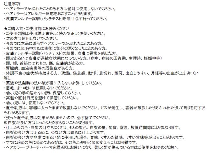 | ★1剤 有効成分:塩酸2.4-ジアミノフェノキシエタノール、トルエン-2.5-ジアミン、パラアミノフェノール、レゾルシン、5-アミノオルトクレゾール その他の成分:亜硫酸ナトリウム、エタノール、エデト酸四ナトリウム四水塩、塩化アルキルトリメチルアンモニウム、加水分解シルク液、強アンモニア水、高重合メチルポリシロキサン(1)、シア脂、スクワラン、ステアリルアルコール、精製水、セタノール、濃グリセリン、フェノキシエタノール、ホホバ油、ポリ塩化ジメチルジメチレンピロリジニウム液、ポリオキシエチレンセチルエーテル、メチルポリシロキサン、モノエタノールアミン、流動パラフィン、L-アスコルビン酸、香料 ★2剤 有効成分:過酸化水素 その他の成分:エタノール、塩化ステアリルトリメチルアンモニウム、水酸化カリウム、精製水、セタノール、ヒドロキシエタンジホスホン酸液、ポリオキシエチレンステアリルエーテル、流動パラフィン ★プレトリートメントPR 水、エタノール、BG、グリセリン、加水分解シルク、水酸化K、乳酸、ヒドロキシエチルセルロース、ヒバマタエキス、ポリクオタニウム-10、メチルパラベン、EDTA-2Na ★アフターヘアパックAF 水、ジメチコン、セタノール、グリセリン、BG、ベヘントリモニウムクロリド、オレイン酸オレイル、加水分解野菜タンパクPG-プロピルシラントリオール、グルタミン酸、ラフィノース、ダイマージリノール酸水添ヒマシ油、アミノプロピルジメチコン、エタノール、クエン酸、クエン酸Na、ステアルトリモニウムクロリド、メチルパラベン、香料 |