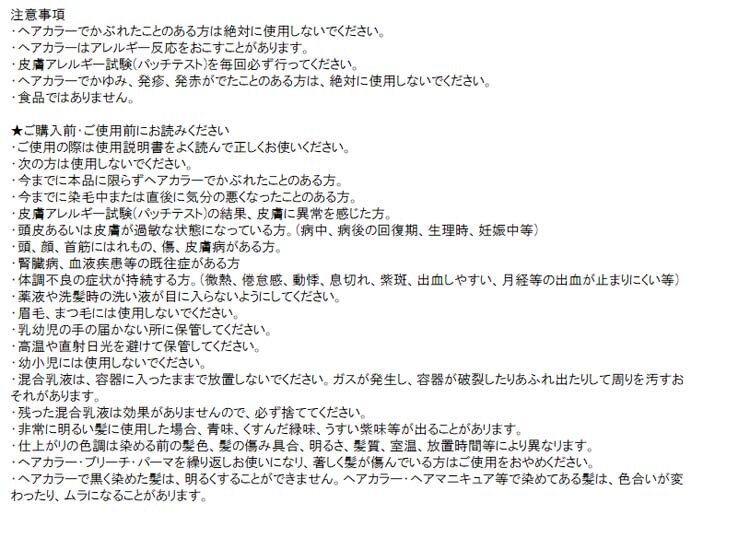 | ★1剤 有効成分:塩酸2.4-ジアミノフェノキシエタノール、トルエン-2.5-ジアミン、パラアミノフェノール その他の成分:亜硫酸ナトリウム、アルモンド油、イソステアロイル加水分解コラーゲン・アミノメチルプロパンジオール塩、エタノール、エデト酸四ナトリウム四水塩、塩化アルキルトリメチルアンモニウム、オレンジ果汁、加水分解コンキオリン液、加水分解シルク液、加水分解ローヤルゼリータンパク液、強アンモニア水、ステアリルアルコール、精製水、セタノール、セチル硫酸ナトリウム、濃グリセリン、ブドウ種子油、ポリ塩化ジメチルジメチレンピロリジニウム液、ポリオキシエチレンセチルエーテル、メチルポリシロキサン、モノエタノールアミン、モモ果汁、流動パラフィン、リンゴ果汁、レゾルシン、レモン果汁、L-アスコルビン酸、香料 ★2剤 有効成分:過酸化水素 その他の成分:ジエチレングリコールモノエチルエーテル、精製水、セタノール、セチル硫酸ナトリウム、ヒドロキシエタンジホスホン酸液、フェノキシエタノール、プロピレングリコール、リン酸、リン酸水素二ナトリウム ★ヘアトリートメントセラムN 水、PG、ジメチコン、BG、ミリスチルアルコール、エタノール、エチルヘキシルグリセリン、グリセリン、ステアルトリモニウムクロリド、ツバキ種子油、ヒドロキシエチルセルロース、フェノキシエタノール、ベヘントリモニウムクロリド、ユチャ油、EDTA-2Na、香料 |