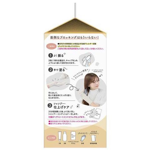 | 1剤:60g、2剤:120mL、ヘアトリートメントセラム:5g、手袋、使用説明書 |