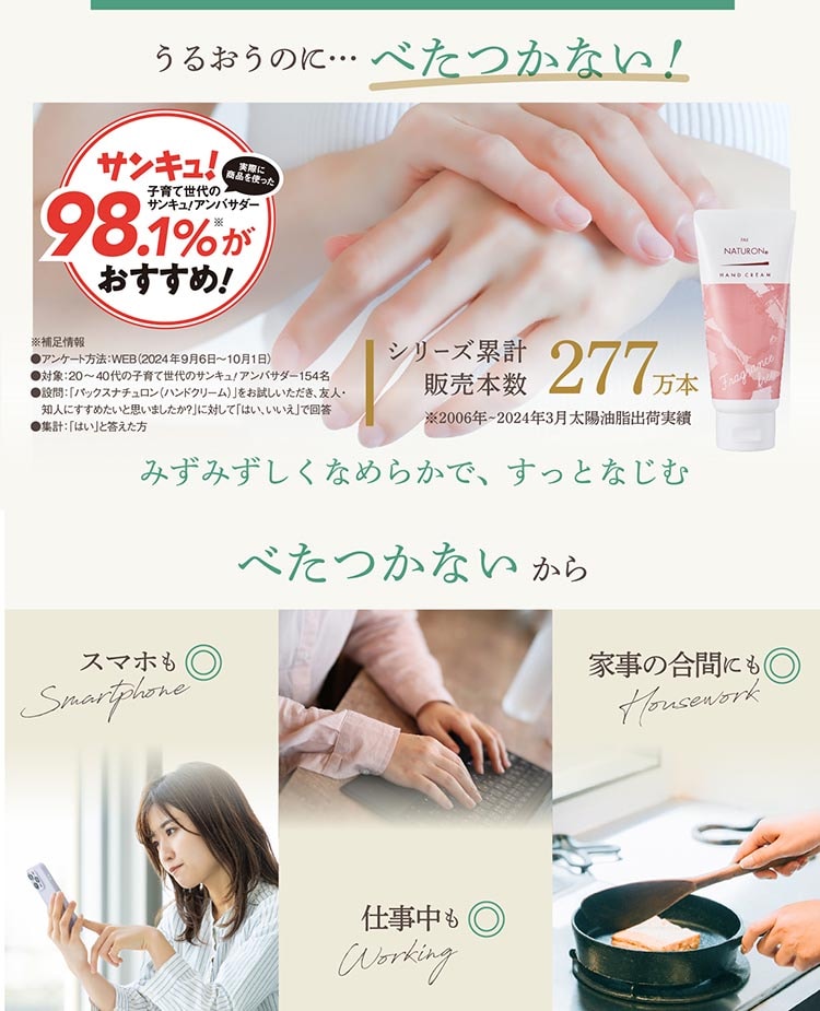 しっかりなじませることでべたつかず、手肌を保湿し、みずみずしいハリのある手もとに導きます。