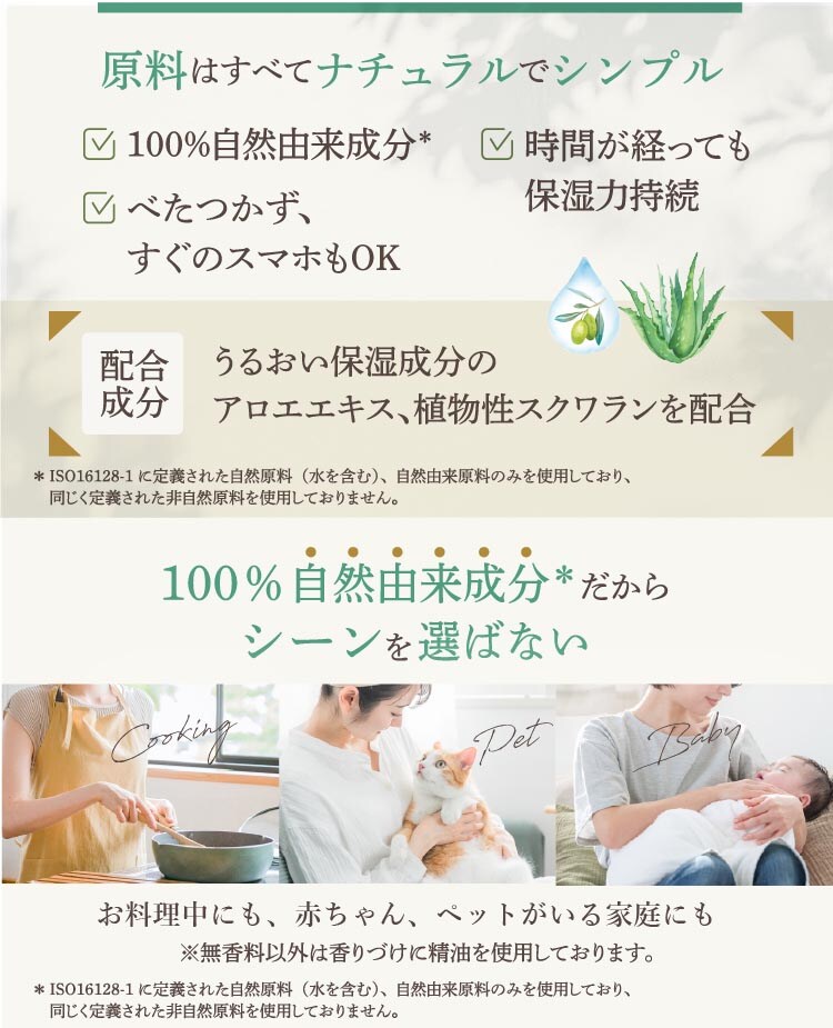 ※ ISO16128-1に定義された自然原料(水を含む)、自然由来原料のみを使用しており、同じく定義された非自然原料を使用しておりません。