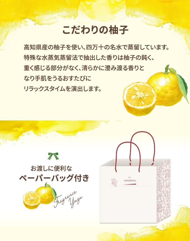 ●特殊な水蒸気蒸留法で抽出した香りは柚子の鈍く、重く感じる部分がなく、清らかに澄み渡る香りとなり手肌をうるおすたびにリラックスタイムを演出します。