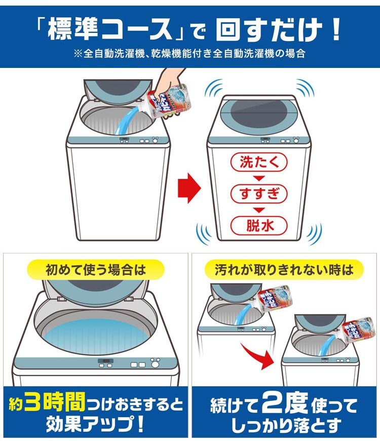 ・本剤を洗濯機に入れ給水した後、約3時間つけおきするといっそう効果的。