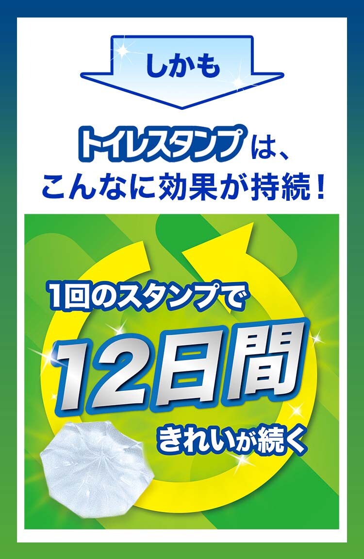 ●1回のスタンプでキレイが12日間続く!流すたびにしっかり洗浄してキレイが続くトイレのスタンプ(※1日約10回流した場合)
