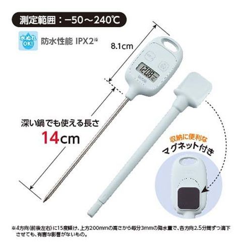 | 最小表示:0.1度 電源:DC3V CR2032コイン形リチウム電池*1個 マグネット:あり 防水性能:防滴仕様:IPX2 フック穴:あり 表示周期:1秒毎 測定範囲:-50~240度 商品寸法:幅 43mm*高さ 221mm*奥行 15mm (センサーホルダー除く) |