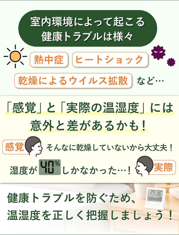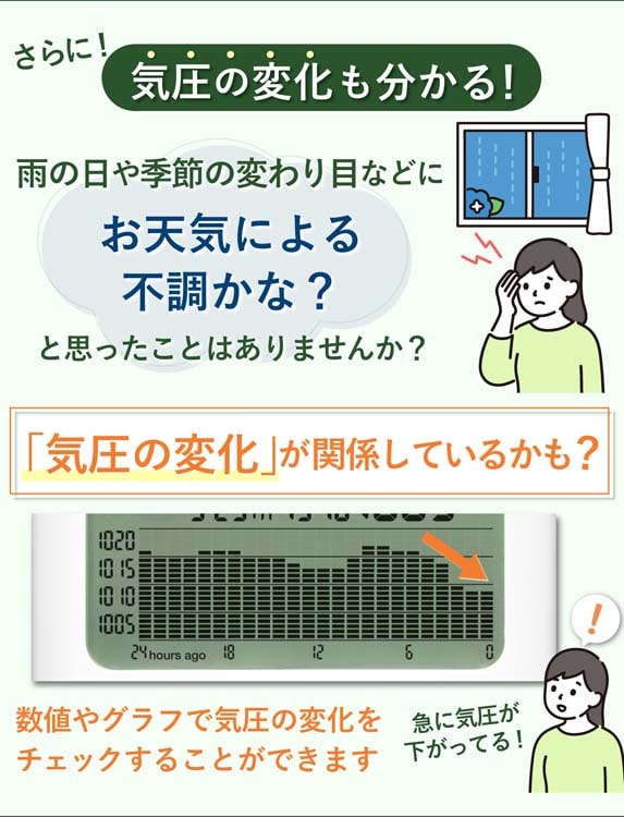 | ★測定範囲 温度:-9.5~50.0度(-9.9度未満のとき「Lo」、50.0度を超えるとき「Hi」) 湿度:20~95%(20%未満のとき「Lo」、95%を超えるとき「Hi」) 気圧:850~1100hPa(850hPa未満のとき「Lo」、1100hPaを超えるとき「Hi」) ★測定精度 温度:0.0~40.0度 ±1.0度 それ以外±2.0度 湿度:35~75% ±5% それ以外±10% 気圧:850~1100hPa ±2hPa ★最小表示 温度:0.1度単位 湿度:1%単位 気圧:1hP ・表示周期:約20秒に1回 ・温度:―9.9~50.0度、1目盛:0.5/1/2/3/4度(自動切替) ・湿度:20~95%、1目盛:1/2/3/4%(自動切替) ・気圧:850~1100hPa、1目盛:0.5/1/2/5/15hPa(自動切替) ・カレンダー:月・日・曜日 ・時計:24時間 ・過去メモリー:当日を含む、7日間 ・時計精度:平均月差 ±60秒以内(23度±5度) ・電池寿命:約1年 ・付属品:取扱説明書(保証書付)、お試し用電池(3V DC 単4形アルカリ乾電池(LR03)×2本) ・その他:フック穴付き |