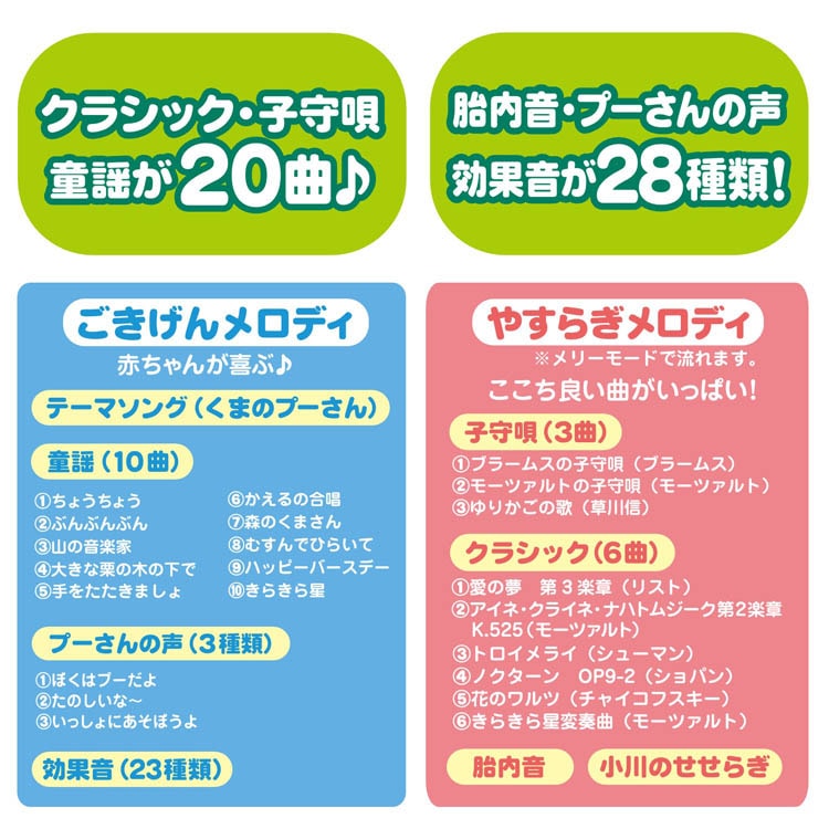 ●クラシックや子守歌、童謡、くまのプーさんのテーマ曲など20曲収録(曲のテンポは変えられます)