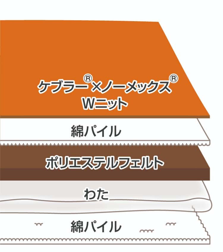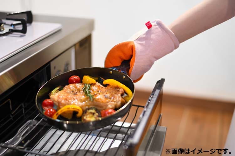 ●消防士の手袋にも使われている丈夫な素材『ケブラー(R)*ノーメックス(R)Wニット』を含む5層構造で高温の熱でも伝わりにくく熱々料理の熱から手を守ります。