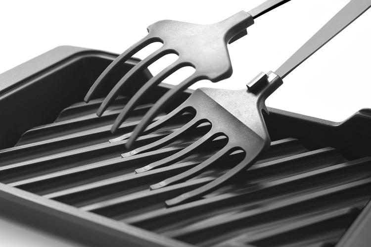 ●炭グリルの溝幅と先端部がぴったり合うつくり。魚の下に入れ込みやすく、身をくずさずしっかりつかめます。