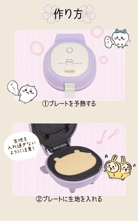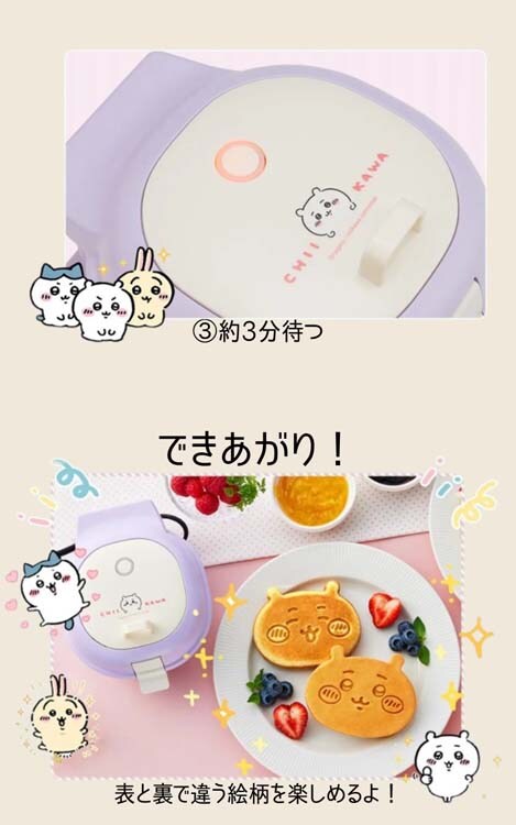 ●生地を入れて待つだけ、簡単。ちいかわのパンケーキの出来上がり。プレートは顔の形状となっており、両面違う表情が楽しめます。
