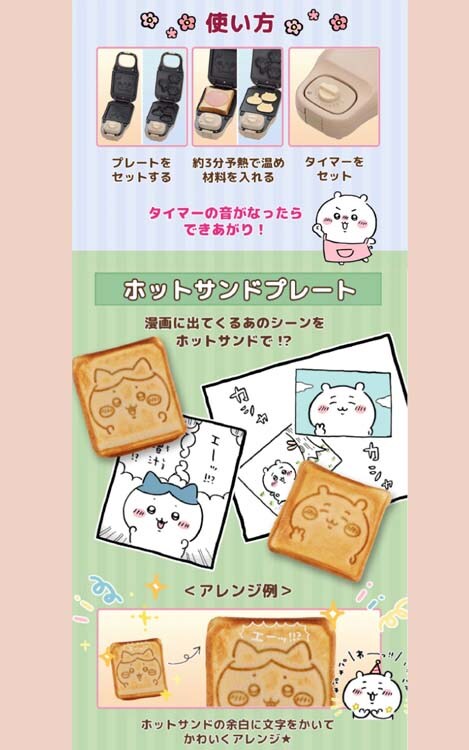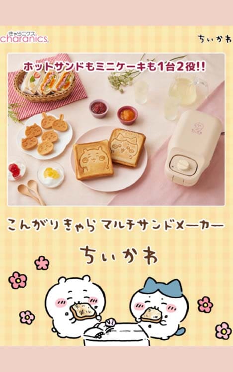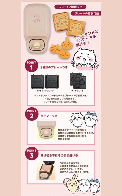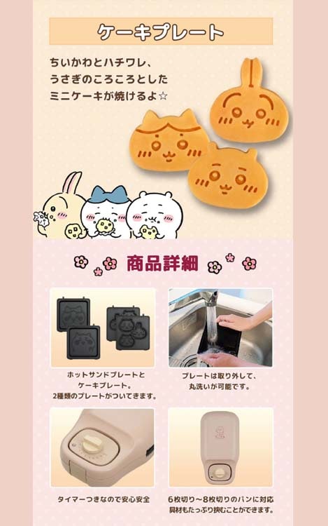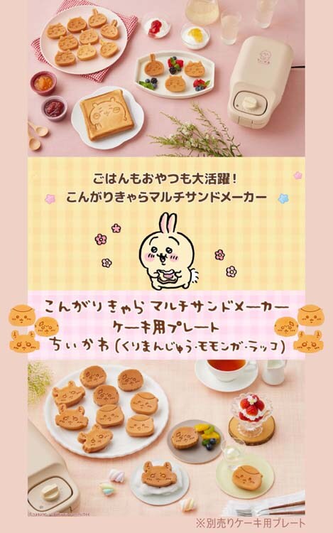 ●裏表でちいかわとハチワレのホットサンドが焼ける「ホットサンドプレート」と、ころころとしたかわいいちいかわ、ハチワレ、うさぎのミニケーキが焼ける「ケーキプレート」が入った一台二役のマルチサンドメーカーです。