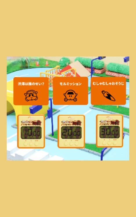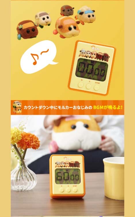 ●収録曲は「渋滞は誰のせい?」「モルミッション」「むしゃむしゃおそうじ」の3曲です。またアラーム音は「モルカーのテーマ」を収録しており、設定時間が経ったことをお知らせします。