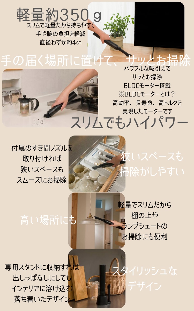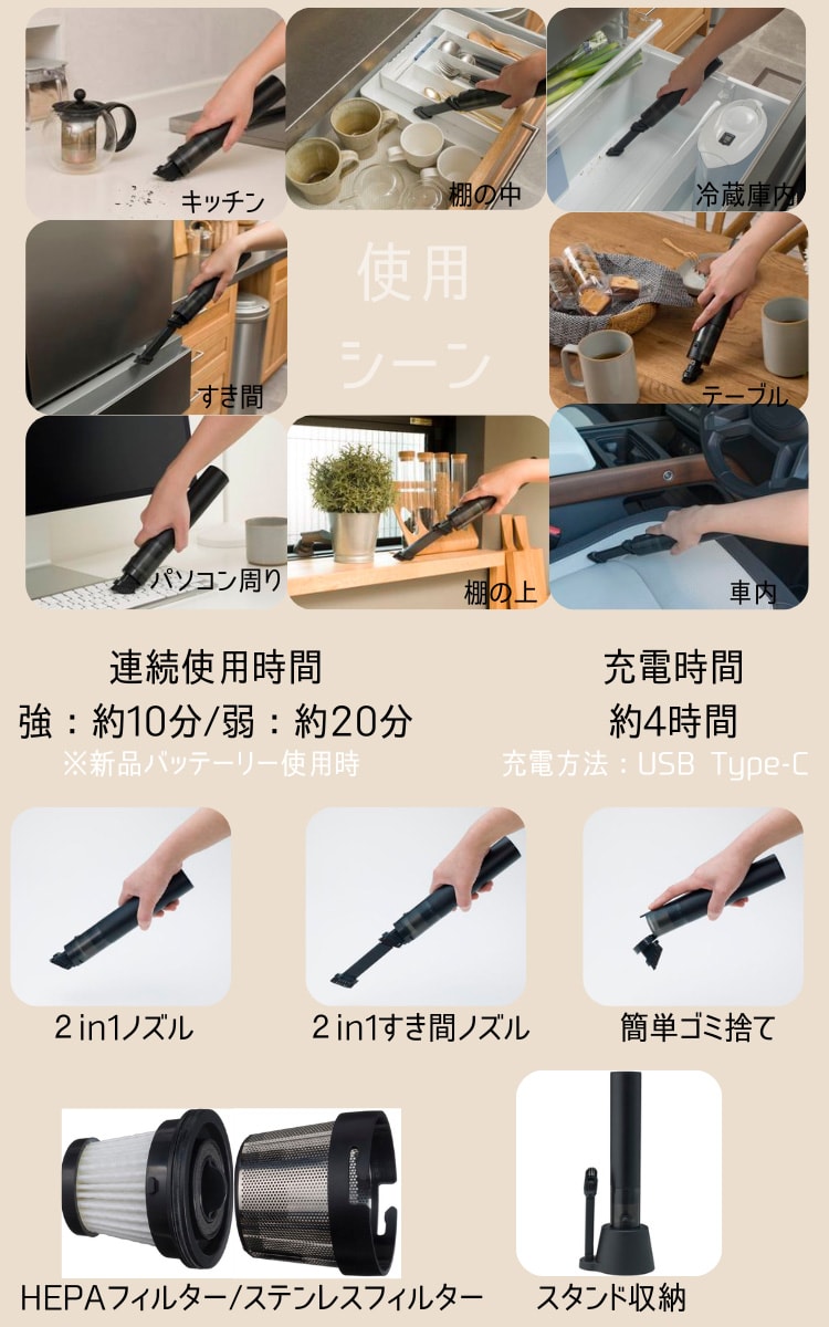 | サイズ:W390×D390×H2500(mm) 本体質量:(約)350g 電源:[入力:DC5V2A]、[出力:DC7.4V2200mA] 電池:リチウムイオン充電式バッテリー7.2V 集塵容量:20ml 運転音:約75dB ケーブルの長さ:1m 使用時間:強:約10分 / 弱:約20分(新品バッテリー使用時) 充電方式:USB Type-C 充電時間:約4時間 モーター:ブラシレスモーター |