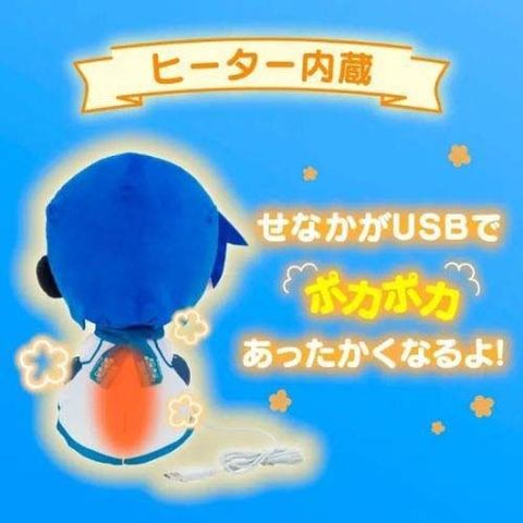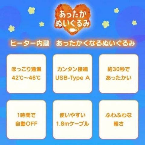 | サイズ:全長約310mm 製品素材:ぬいぐるみ(ポリエステル) USBケーブル(PVC) 定格電圧:DC5V 定格電流:2A 消費電力:3.0W 給電方法:USB Type-A USBケーブル長さ:約1.8m 連続運転時間:約60分(自動電源OFF) 温度:約42度~46度 |