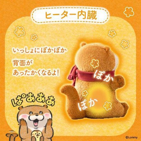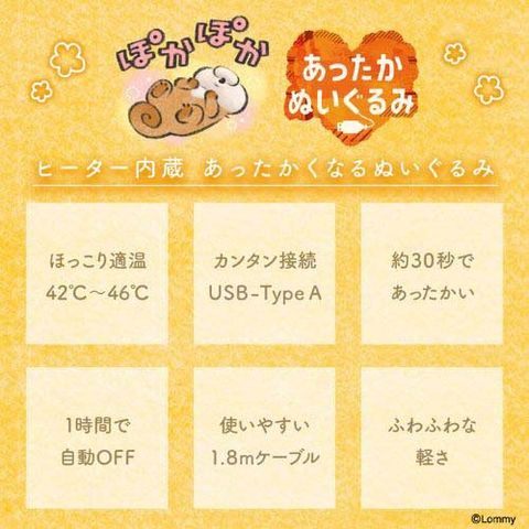 | サイズ: 幅約240×奥行き約250×高さ約300(mm) 重量:330g(USBケーブル含む) 製品素材:ぬいぐるみ(ポリエステル) USBケーブル(PVC) 定格電圧:DC5V 定格電流:2A 消費電力:3.0W 給電方法:USB Type-A USBケーブルの長さ:1.8m 連続運転時間:約60分(自動電源OFF) 温度:約42度~46度 |