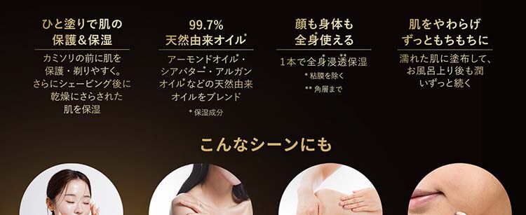 ・カミソリの前に肌を保護・剃りやすくして、さらにシェービング後に乾燥にさらされた肌をやわらげてずっともちもちに。