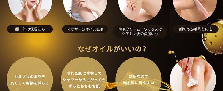 ・STEP3.剃毛後:剃った後に残った毛をぬるま湯で流します。オイルは水をはじくため、石鹸を使用しない限りはオイルの保湿力は残るため再度塗る必要はありません。