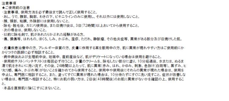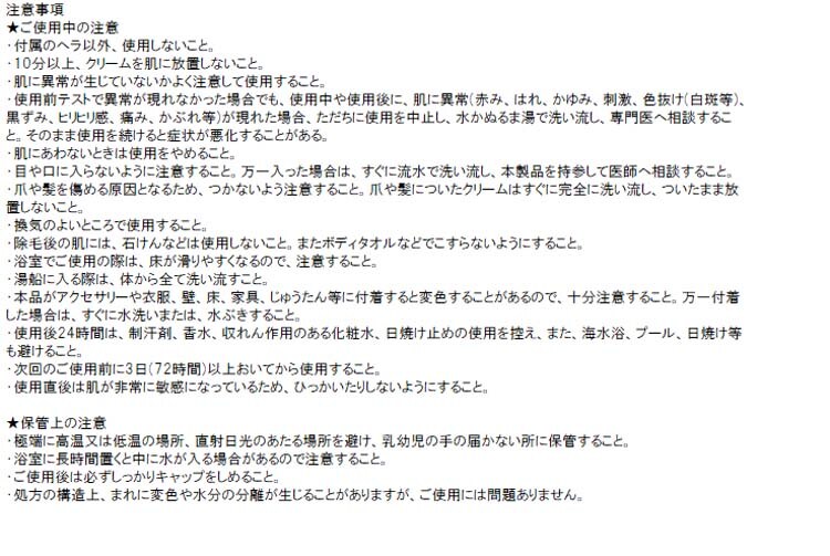 ※塗り始めてから最大10分を超えない範囲で使用すること。(除毛時間はムダ毛の量や毛質により個人差がある。)