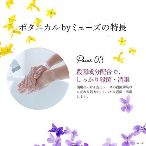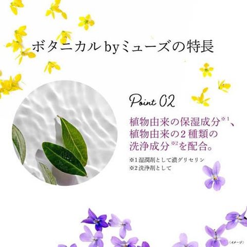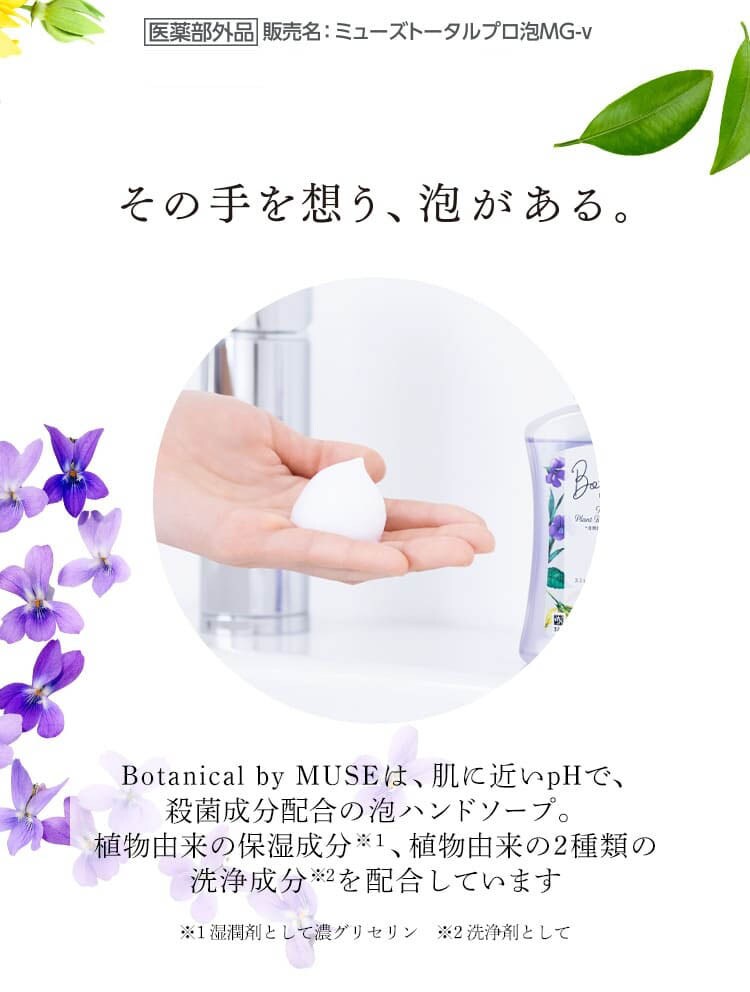 ●「Botanical by Muse(ボタニカルbyミューズ)」は、肌に近いpHで、殺菌成分配合の泡ハンドソープ。植物由来の保湿成分※2、植物由来の2種類の洗浄成分※3を配合しています。