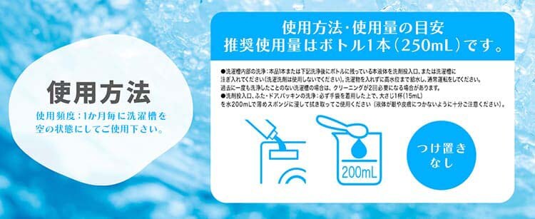 ・洗濯槽内部の洗浄:本品1本または下記洗浄後にボトルに残っている本液体を洗剤投入口、または洗濯槽に注ぎ入れてください(洗濯洗剤は使用しないでください)。