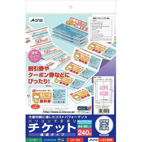 エーワン 手作り チケット ミシン目 2列6連 連続 51469 (20シート)