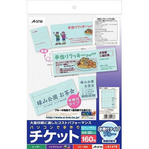 【エーワン 手作り チケット ミシン目 8面 半券付 ブルー51476の商品詳細】