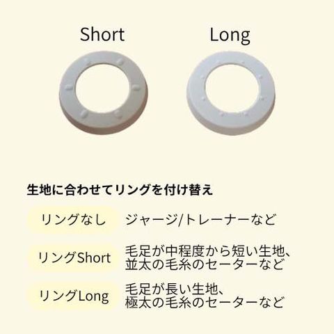 ・リングShort:毛足が中程度から短い生地、並太の毛糸のセーターなど