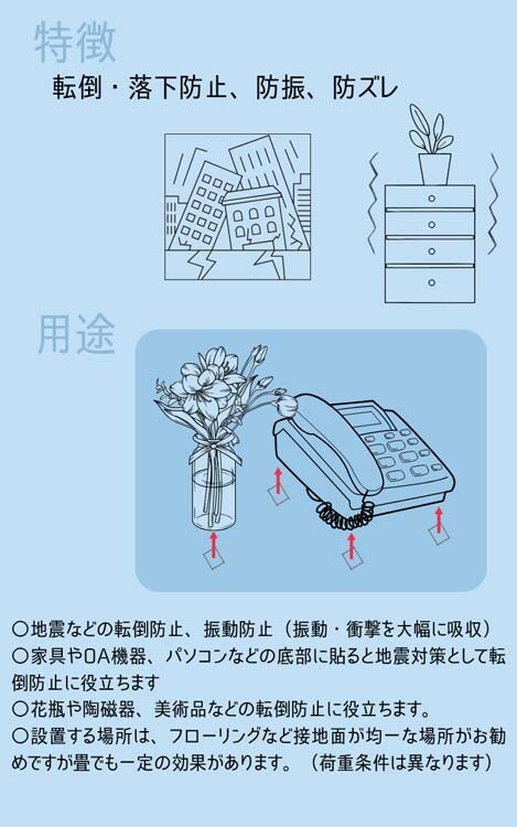 家具やOA機器、パソコンなどの底部に貼ると地震対策として転倒防止に役立ちます。