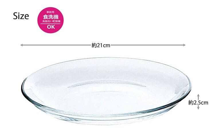 | 本体サイズ(cm):約φ21.0×2.5、最大径約21.0(1個あたり) 本体重量(g):475(1個あたり) 素材・材質:ソーダライムガラス 原産国:日本 カラー:クリア |