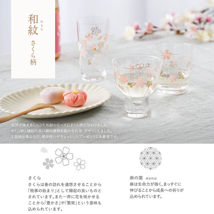 ●美しいさくら模様で乾杯!お気に入りの銘柄のお酒をご自宅で楽しみたい方におすすめの冷酒グラスです。