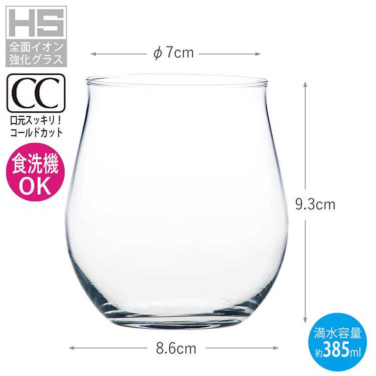 | 本体サイズ:約φ7×9.3cm、最大径約8.6cm(1個あたり) 本体重量:約315g 素材・材質:ソーダライムガラス 原産国:日本 容量:約385ml 食洗機対応:可 |