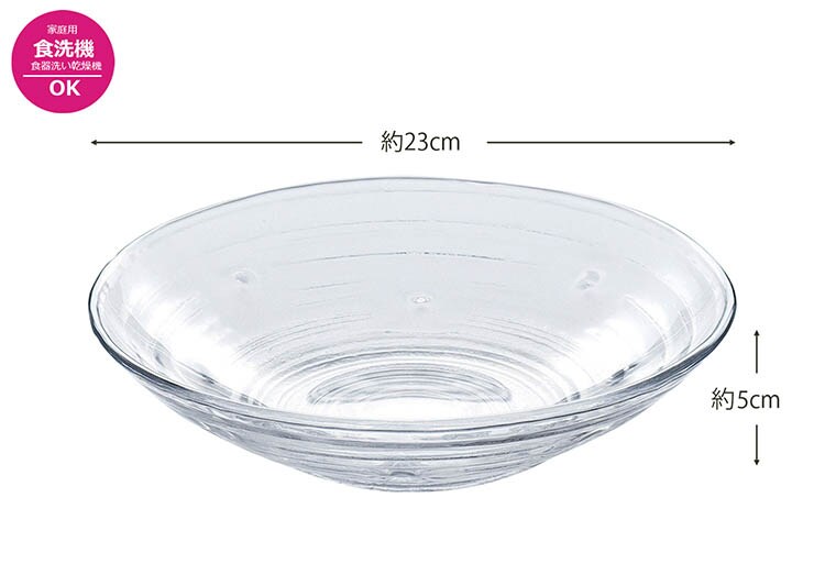 | 本体サイズ(cm):約φ23.0×5.0、最大径約23.0(1個あたり) 本体重量(g):580(1個あたり) 素材・材質:ソーダライムガラス 原産国:日本 カラー:クリア |