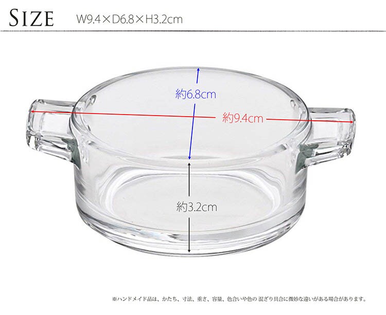 | 本体サイズ(cm):約9.4×6.8×3.2(1個あたり) 本体重量(g):110(1個あたり) 素材・材質:ソーダライムガラス 原産国:中国 カラー:クリア |