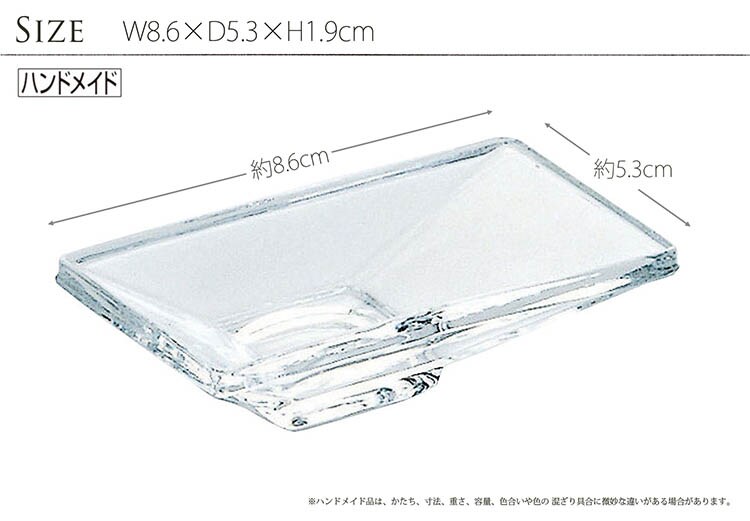 | 本体サイズ(cm):約8.6×5.3×1.9(1個あたり) 本体重量(g):55(1個あたり) 素材・材質:ソーダライムガラス 原産国:中国 カラー:クリア |
