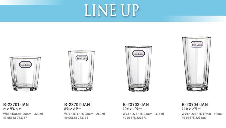●ソフトドリンクからアルコール飲料まで幅広くお使いいただける4サイズをご用意しました。