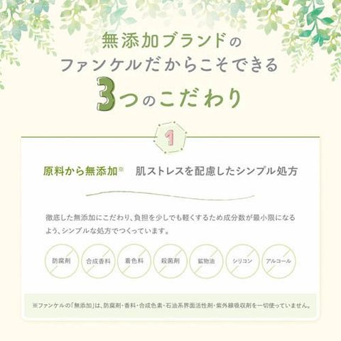 ・ご使用中、赤み、はれ、かゆみ、しげき、色抜け(白斑等)や黒ずみ等の異常があらわれた時にはご使用をおやめください。そのまま使用を続けますと、症状を悪化させることがありますので、ファンケル美容相談室あるいは皮膚科専門医にご相談ください。