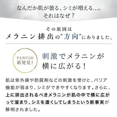 ・ご使用中、赤み、はれ、かゆみ、しげき、色抜け(白斑等)や黒ずみ等の異常があらわれた時にはご使用をおやめください。そのまま使用を続けますと、症状を悪化させることがありますので、ファンケル美容相談室あるいは皮膚科専門医にご相談ください。