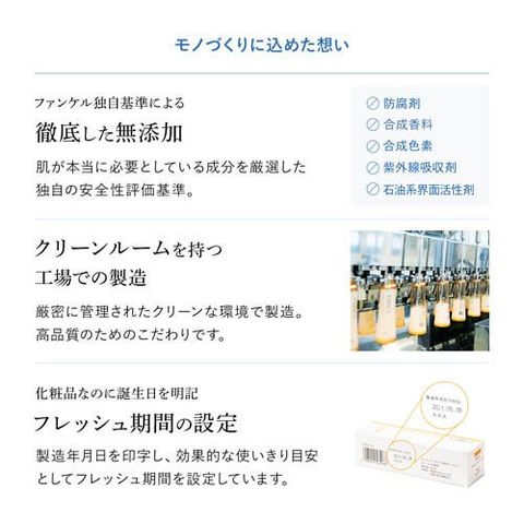 ・ご使用中、赤み、はれ、かゆみ、しげき、色抜け(白斑等)や黒ずみ等の異常があらわれた時にはご使用をおやめください。そのまま使用を続けますと、症状を悪化させることがありますので、ファンケル美容相談室あるいは皮膚科専門医にご相談ください。