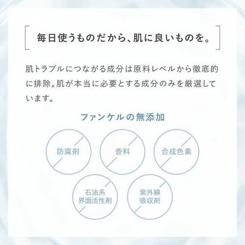 ・ご使用中、赤み、はれ、かゆみ、しげき、色抜け(白斑等)や黒ずみ等の異常があらわれた時にはご使用をおやめください。そのまま使用を続けますと、症状を悪化させることがありますので、ファンケル美容相談室あるいは皮膚科専門医にご相談ください。