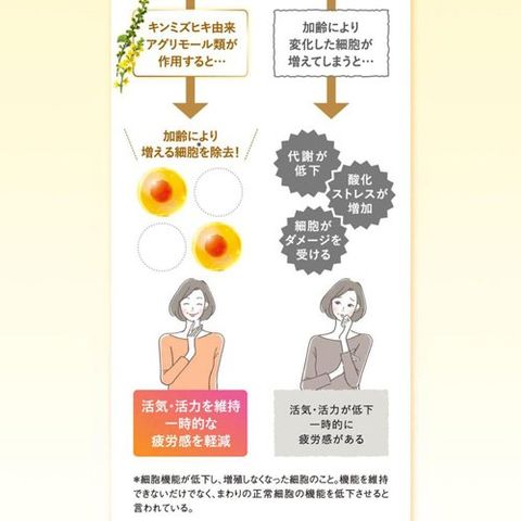 届出表示:本品にはキンミズヒキ由来アグリモール類が含まれるので、活気・活力の低下や疲れを感じやすい中高年の前向きな気分(生き生きする、積極的な気分、活気がわいてくる、やる気)を維持する機能があります。また、日常生活における一時的な疲労感を軽減する機能があります。