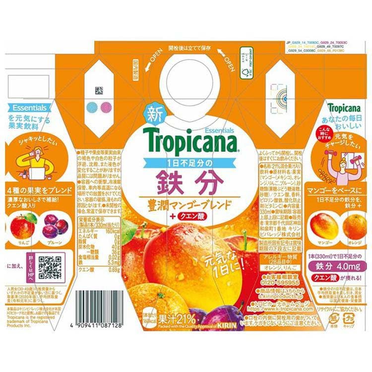 ●「トロピカーナ エッセンシャルズ 鉄分」は、甘く熟したマンゴーがベースの果実ブレンドで、プルーンなどの果実と合わせた、濃厚な味わいです(果汁21%)。