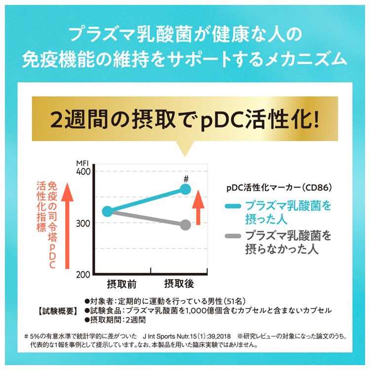 届出表示:本品には、プラズマ乳酸菌(L.lactis strain Plasma)が含まれます。プラズマ乳酸菌はpDC(プラズマサイトイド樹状細胞)に働きかけ、健康な人の免疫機能の維持に役立つことが報告されています。