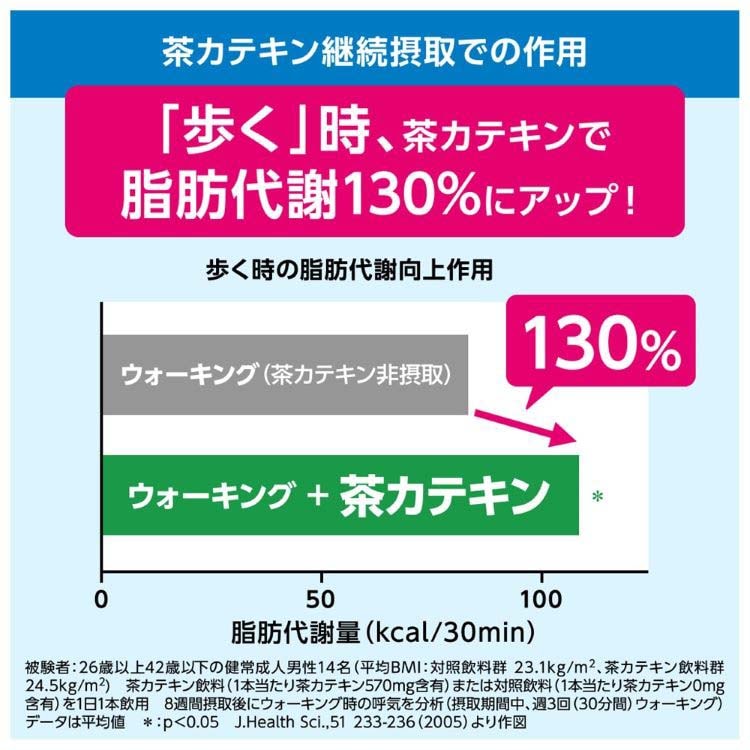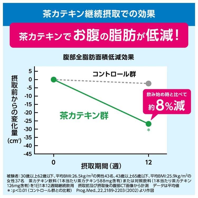 許可表示:本品は、脂肪の分解と消費に働く酵素の活性を高める茶カテキンを豊富に含んでおり、脂肪を代謝する力を高め、エネルギーとして脂肪を消費し、体脂肪を減らすのを助けるので、体脂肪が多めの方に適しています