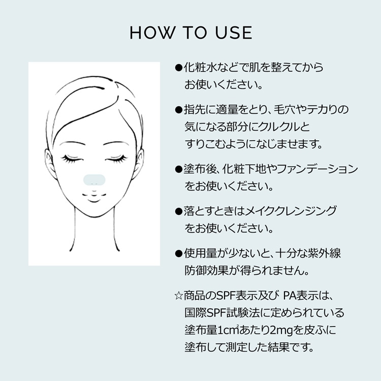 ・指先に適量をとり、毛穴やテカりの気になる部分にクルクルとすりこむようになじませます。