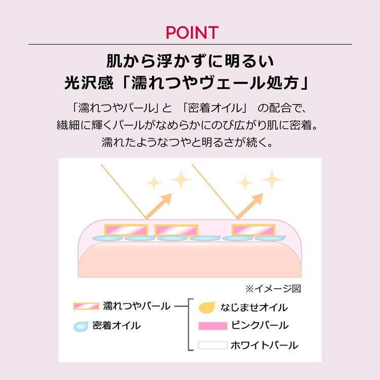 ●濡れつやヴェール処方で繊細に輝くパールがなめらかにのび広がり、肌に密着。