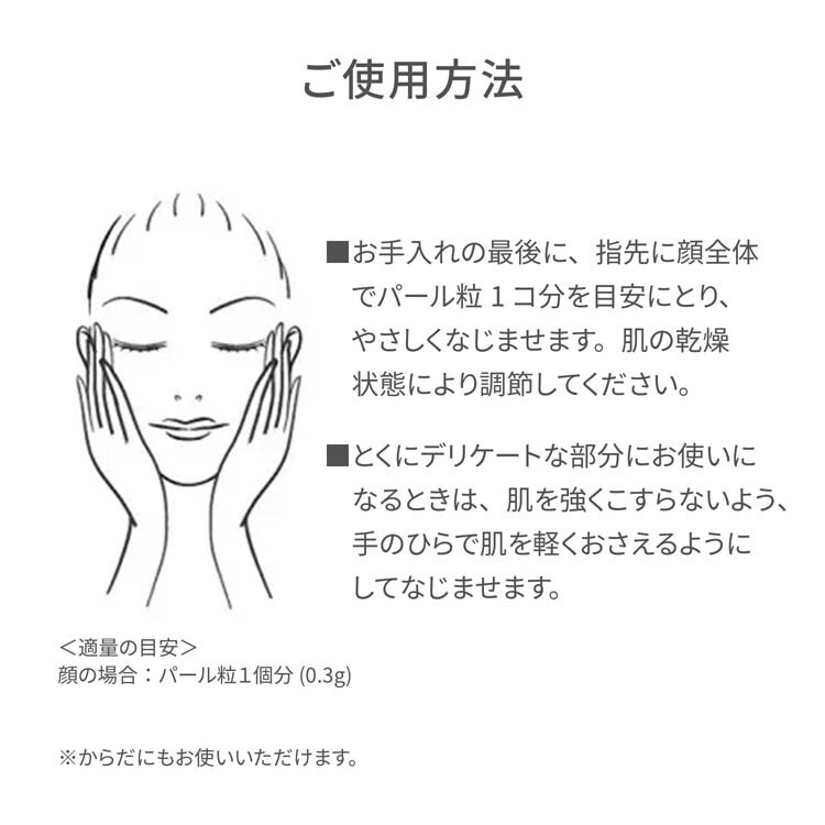 指先に適量をとり、乾燥しやすい部位に指先でやさしくなじませます。とくにデリケートな部分にお使いになるときは、肌を強くこすらないよう、手のひらで軽くおさえるようにしてなじませます。
